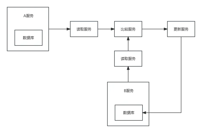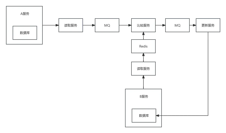 从A服务中读取的数据可以放在MQ中,从B服务读取的数据可以放在Redis中,比较服务监听MQ,从MQ中获取到数据后和Redis中的数据进行比较