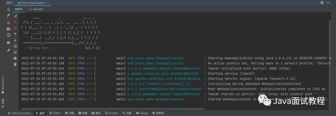 运行检查:执行alt+shift+x或鼠标点击IDE右上角绿色三角箭头,启动DemoApplication项目,一切正常!