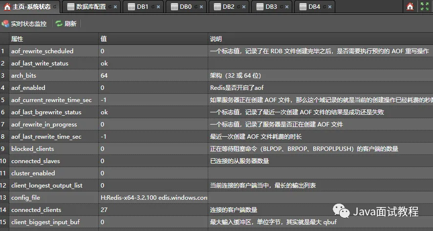 在主页会显示各类属性的配置,这需要Redis的运维知识才能看懂。