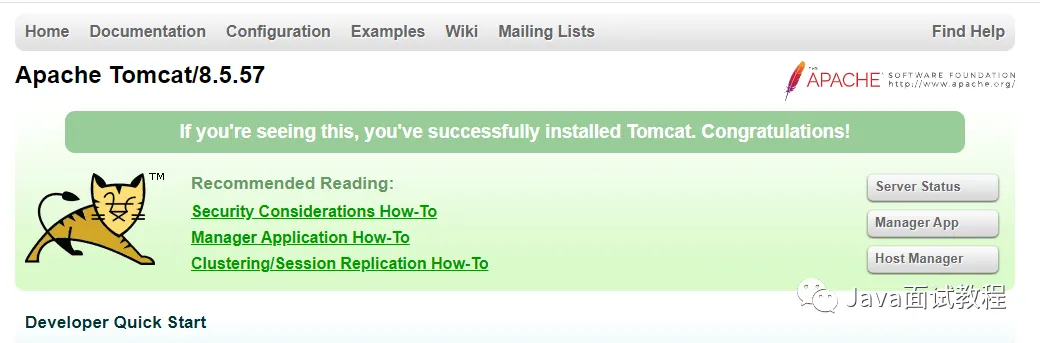 此时打开浏览器,访问 http://192.168.2.244:8080 看到Tomcat欢迎页,表示安装成功。