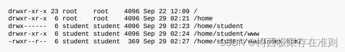 例题:有一个文件全名为 /home/student/www/index.html ,各相关文件/目录的权限如下: