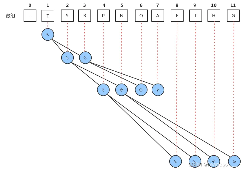 如果一个结点的位置为k,则它的父结点的位置为[k/2],而它的两个子结点的位置则分别为2k和2k+1。这样,在不使用指针的情况下,我们也可以通过计算数组的索引在树中上下移动:从a[k]向上一层,就令k等于k/2,向下一层就令k等于2k或2k+1。