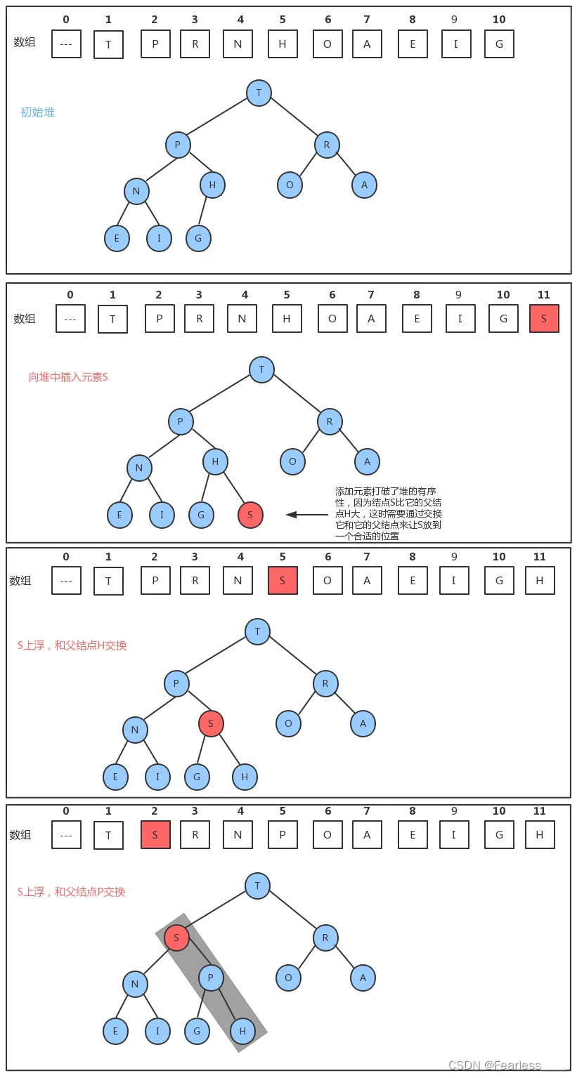- 重复2~4这个步骤,直到堆中剩一个元素为止;