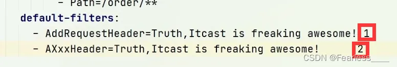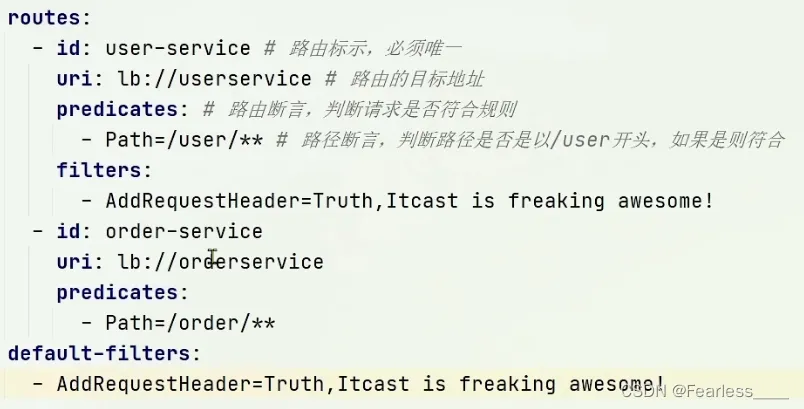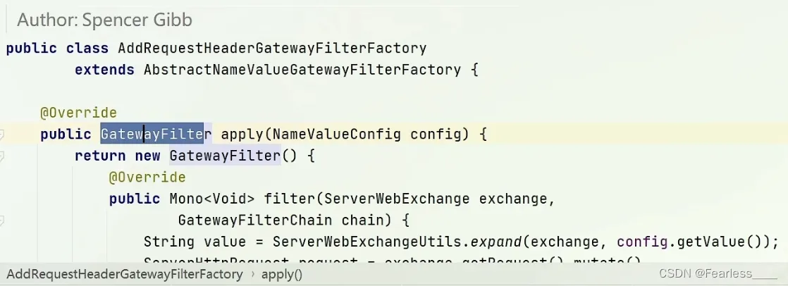 上图中的两个AddRequestHeader,他们在java的底层都来源于同一个过滤器工厂,生成的真正过滤器都是GatewayFilter,所以我们认为 路由过滤器 和 DefaultFilter 都是同一种过滤器 GatewayFilter