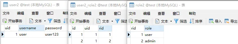 – 1个用户,拥有2个角色 INSERT INTO user2_role2 VALUES (1, 1, 1); INSERT INTO user2_role2 VALUES (2, 1, 2);