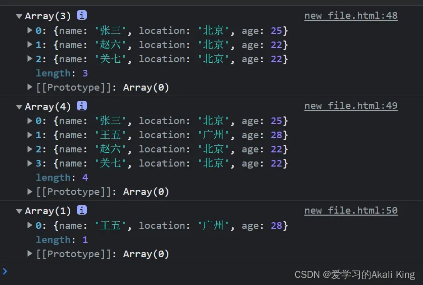 const data = [{ name: '张三', location: '北京', age: 25 }, { name: '李四', location: '上海', age: 30 }, { name: '王五', location: '广州', age: 28 }, { name: '赵六', location: '北京', age: 22 }, { name: '关七', location: '北京', age: 22 } ];