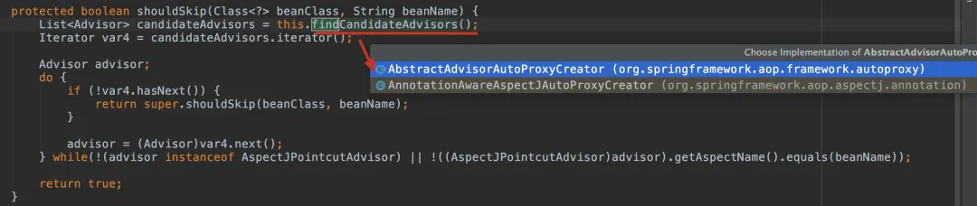 public List<Advisor> findAdvisorBeans() { String[] advisorNames = this.cachedAdvisorBeanNames; if (advisorNames == null) { advisorNames = BeanFactoryUtils.beanNamesForTypeIncludingAncestors(this.beanFactory, Advisor.class, true, false); this.cachedAdvisorBeanNames = advisorNames; } if (advisorNames.length == 0) { return new ArrayList(); } else { List<Advisor> advisors = new ArrayList(); String[] var3 = advisorNames; int var4 = advisorNames.length; for(int var5 = 0; var5 < var4; ++var5) { String name = var3[var5]; if (this.isEligibleBean(name)) { if (this.beanFactory.isCurrentlyInCreation(name)) { if (logger.isTraceEnabled()) { logger.trace("Skipping currently created advisor '" + name + "'"); } } else { try { // 核心方法 advisors.add(this.beanFactory.getBean(name, Advisor.class)); } catch (BeanCreationException var11) { Throwable rootCause = var11.getMostSpecificCause(); if (rootCause instanceof BeanCurrentlyInCreationException) { BeanCreationException bce = (BeanCreationException)rootCause; String bceBeanName = bce.getBeanName(); if (bceBeanName != null && this.beanFactory.isCurrentlyInCreation(bceBeanName)) { if (logger.isTraceEnabled()) { logger.trace("Skipping advisor '" + name + "' with dependency on currently created bean: " + var11.getMessage()); } continue; } } throw var11; } } } } return advisors; } }