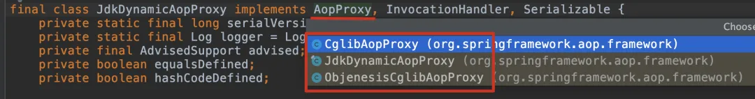 AopProxy 接口类提供了 getProxy 方法来获取代理对象,其中有三个实现如下图。