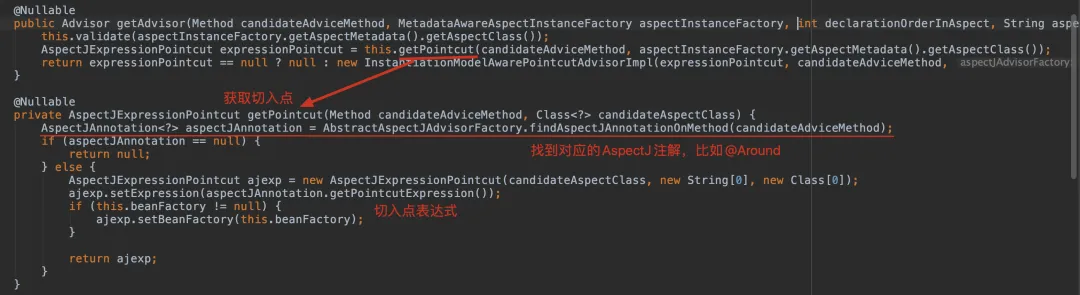 @Nullable public Advisor getAdvisor(Method candidateAdviceMethod, MetadataAwareAspectInstanceFactory aspectInstanceFactory, int declarationOrderInAspect, String aspectName) { this.validate(aspectInstanceFactory.getAspectMetadata().getAspectClass()); AspectJExpressionPointcut expressionPointcut = this.getPointcut(candidateAdviceMethod, aspectInstanceFactory.getAspectMetadata().getAspectClass()); return expressionPointcut == null ? null : new InstantiationModelAwarePointcutAdvisorImpl(expressionPointcut, candidateAdviceMethod, this, aspectInstanceFactory, declarationOrderInAspect, aspectName); }