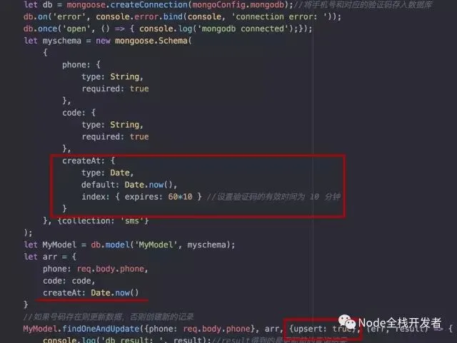 注意红色圈出来的部分,在 schema 中 必须定义一个 date 类型的数据,且给其加上索引并设置 expires 即有效时间,实际操作的数据 arr 必须与此 schema 对应( 我在这卡了一整天才踏过了这个坑 ),对于存储则是此手机号若有记录则更新,若没有则直接创建,所以用了 findOneAndUpdate 并且有了最后的红色圈的设置。