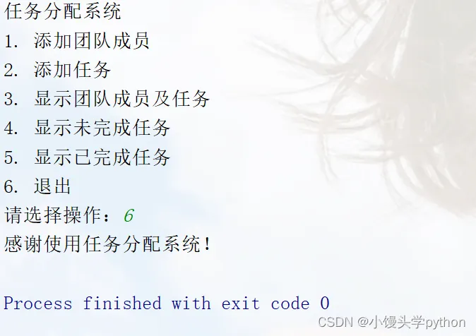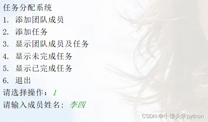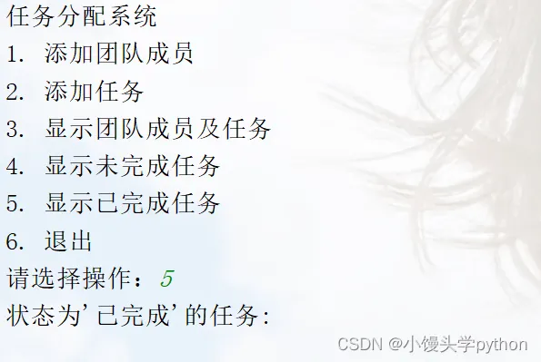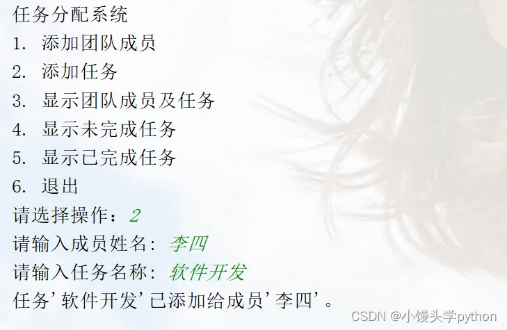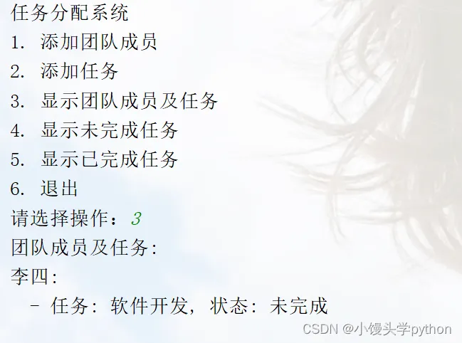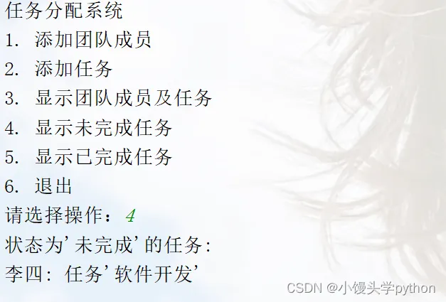 这个案例实现了一个简单的任务分配系统,你可以根据提示选择不同的操作。通过输入和输出,你可以添加团队成员、为成员分配任务,显示团队成员及其任务,以及根据任务状态筛选任务列表。