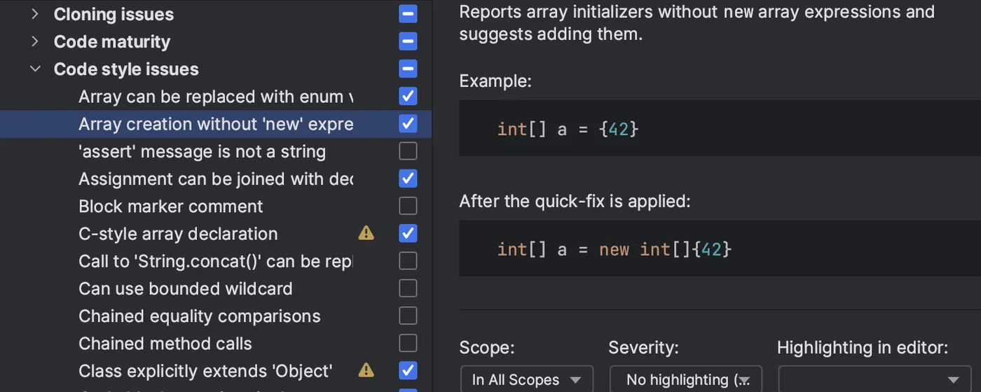 在 _Settings / Preferences | Editor | Inspections_(设置/偏好设置 | 编辑器 | 检查)中,代码示例现在将包含语法高亮显示,让您可以更容易理解是什么触发了检查并决定使其处于活跃状态还是停用状态。