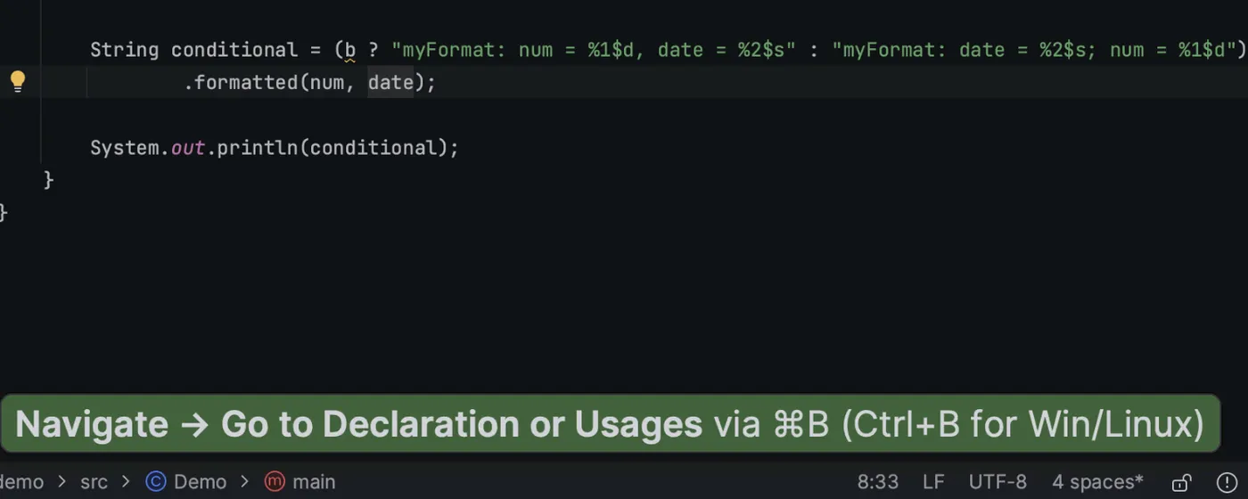现在,将文本光标置于格式说明符上后,IDE 将高亮显示相应实参和指向它的其他说明符。 此外,您现在可以使用 _Go To Declaration_(转到声明)(Ctrl+B) 跳转到特定格式字符串占位符的关联代码位置。