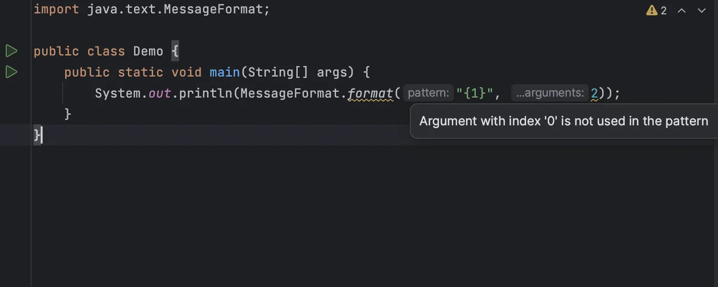 我们改进并扩展了 Java 检查,帮助您维护优质代码并更有效地检测潜在问题。 当模式引用与实参不匹配时,新的 _Incorrect ‘MessageFormat’ pattern_('MessageFormat' 模式不正确)检查会发出警告,并且它还会检测 MessageFormat 模式中引号和大括号的错误用法。 此外,IDE 现在将报告带有显式 ChronoField 或 ChronoUnit 实参的调用,并建议将其替换为更具体的方法的调用,从而简化代码。 在这篇博文中详细了解 IntelliJ IDEA 2023.2 中的新检查和其他代码分析改进。