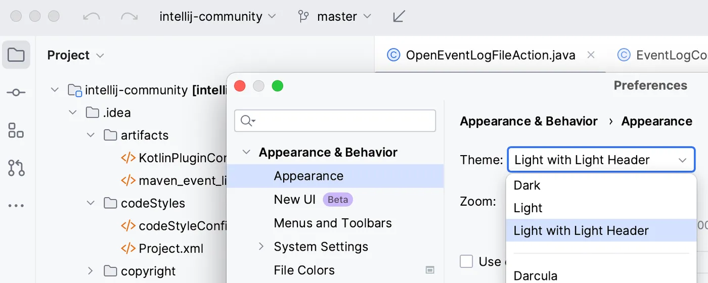 在 v2023.2 中,我们通过引入替代的 _Light with Light Header_(带有浅色标题的浅色主题)选项提升了_浅色_主题的用户体验,该选项可为窗口标题、工具提示和通知气球提供匹配的浅色。