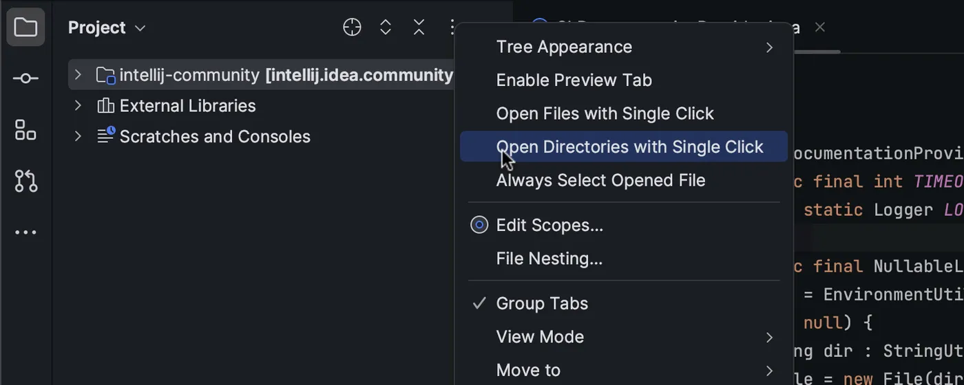 在 _Project_(项目)视图中,新增了 _Open Directories with Single Click_(单击打开目录)选项,可以更快展开和收起项目文件夹,更快响应。 点击竖三点菜单后,可以从下拉菜单中选择该选项。