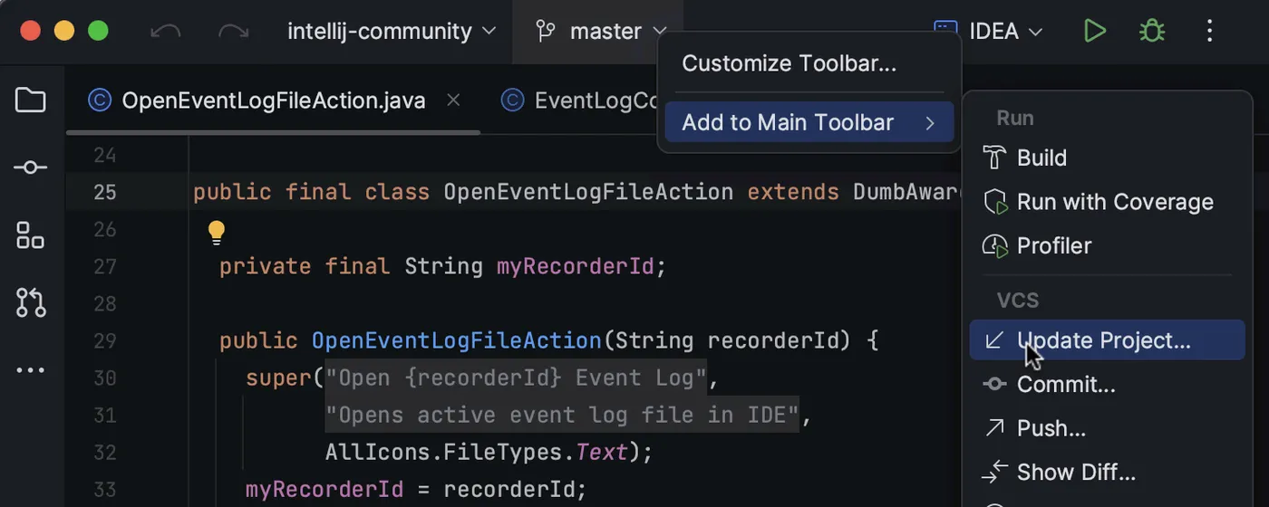 我们扩展了新 UI 主工具栏的自定义选项。 现在,您可以使用下拉菜单快速选择要添加到工具栏的操作。 右键点击任意微件,选择 _Add to Main Toolbar_(添加到主工具栏),然后浏览可用选项。