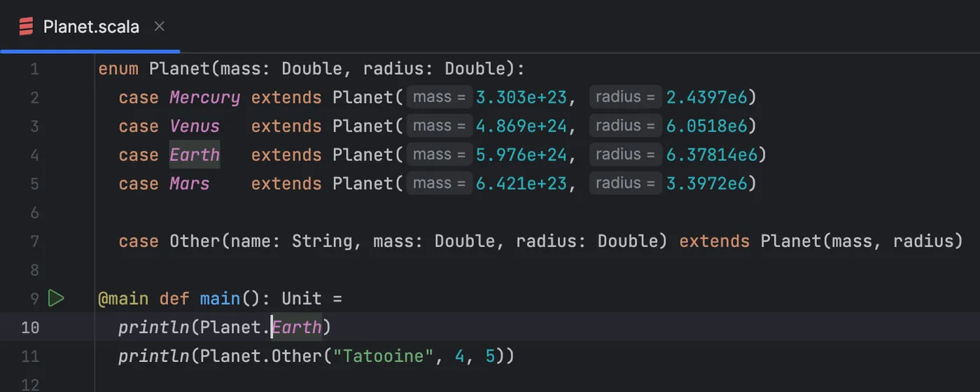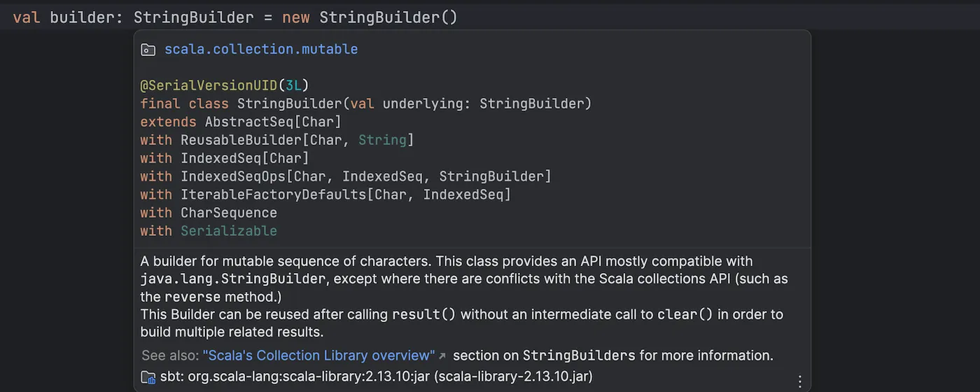 在这个版本中,ScalaDoc 的快速文档与 Javadoc 的更加一致。 现在,显示的声明中的注解、关键字和文字将根据所选主题高亮显示。 如果超出可用空间,扩展的特征和类的列表将分成多行。 此外,文档中现在也支持 Scala 3 关键字。