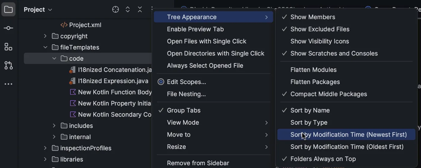 IntelliJ IDEA 2023.2 添加了备受期待的功能,让您可以根据修改时间在 _Project_(项目)视图中排列文件。 每当项目中有更改被保存时,这个新功能就会自动重排文件。 要启用此功能,首先打开 _Project_(项目)视图中的竖三点菜单,然后选择 _Tree Appearance | Sort by Modification Time_(树外观 | 按修改时间排序)。