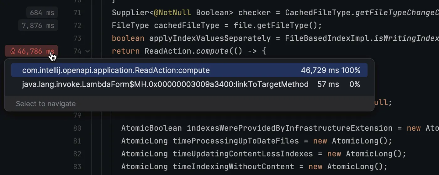 Ultimate 在 IntelliJ IDEA 2023.2 中,我们增强了 IntelliJ 分析器,为应用程序性能提供更有价值且易于理解的洞察。 新的编辑器内提示可供快速逐行分析代码性能,帮助您更快识别和解决问题。 编辑器装订区域中的颜色编码注解可以高亮显示关键方法,让您专注于性能瓶颈。 因此,您不再需要使用 _Flame Graph_(火焰图)和 _Call Tree_(调用树)视图执行彻底、耗时的分析。 在这篇博文中了解详情。