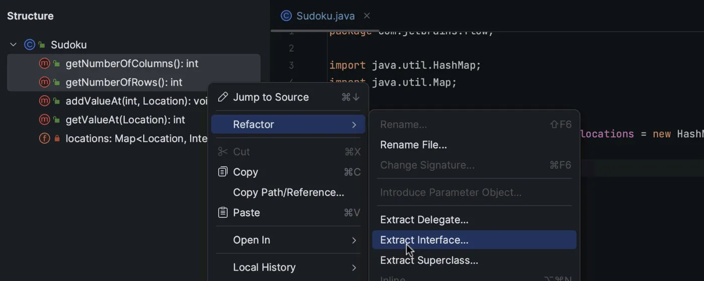 我们添加了新方式,可供同时将特定重构应用于多个成员。 现在,您可以在 _Project_(项目)或 _Structure_(结构)工具窗口中直接选择多个成员,同时对其调用 _Extract Delegate_(提取委托)、_Extract Interface_(提取接口)、_Extract Superclass_(提取超类)、_Pull Members Up_(向上拉取成员)和 _Push Members Down_(向下推送成员)。 此外,IntelliJ IDEA 现在支持以多文本光标选择进行扩展范围的重构,包括 _Encapsulate Fields_(封装字段)、_Move Static Members_(移动 static 成员)、_Extract Delegate_(提取委托)、_Extract Interface_(提取接口)和 _Extract Superclass_(提取超类)。 要利用此功能,请将文本光标放置在您希望应用重构的各成员中,IDE 将自动在重构对话框中预选并检查这些成员。