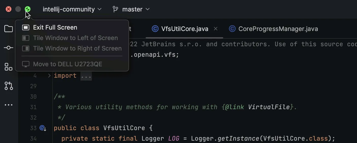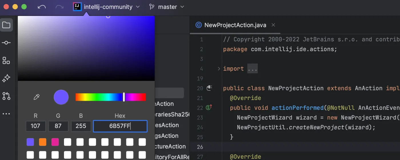IntelliJ IDEA 2023.2 引入了彩色标题,可以简化多个打开的项目之间的导航。 现在,您可以为每个项目分配唯一的颜色和图标,使其在工作区中更易区分。 标题现在默认带有预定义的颜色,但您也可以自定义。 要为项目设置新的颜色,首先右键点击标题,然后访问上下文菜单。 然后,选择 _Change Project Color_(更改项目颜色)选项,并从建议的列表中选择所需颜色,或者浏览调色盘。 如果您想禁用此功能,只需在上下文菜单中取消选择 _Show Project Gradient_(显示项目渐变)选项。