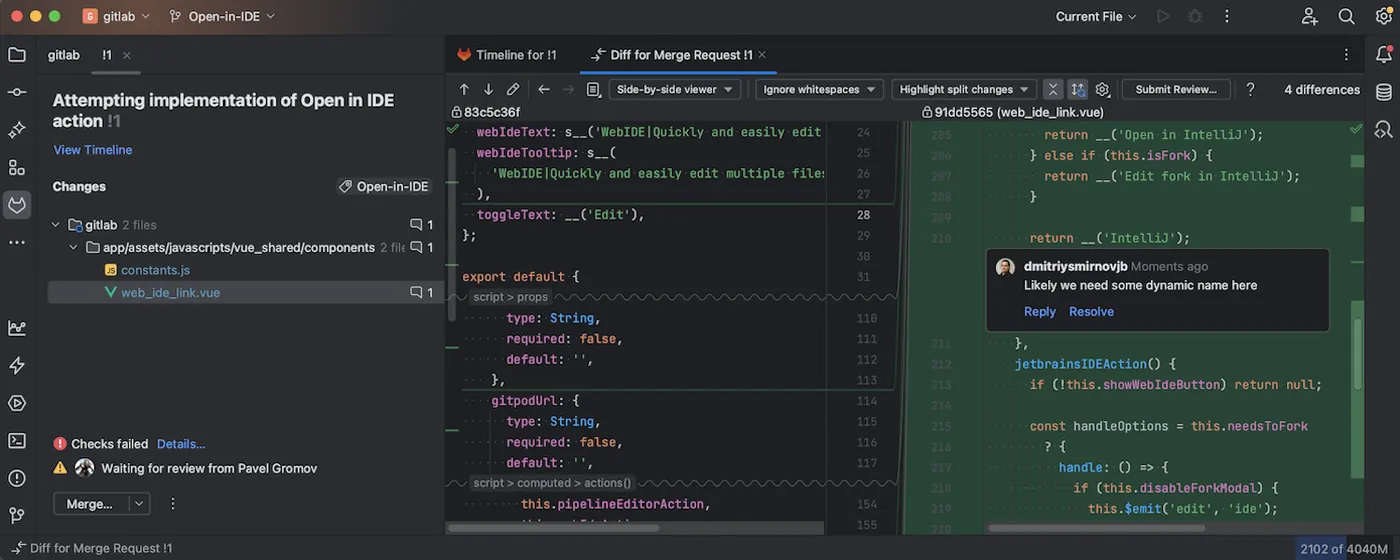 IntelliJ IDEA 2023.2 引入了与 GitLab 的集成,帮助简化您的开发工作流。 现在,您可以直接在 IDE 中使用 _Merge Requests_(合并请求)功能:查看请求列表、检查更改、留下评论,以及导航到相关视图。 了解详情。