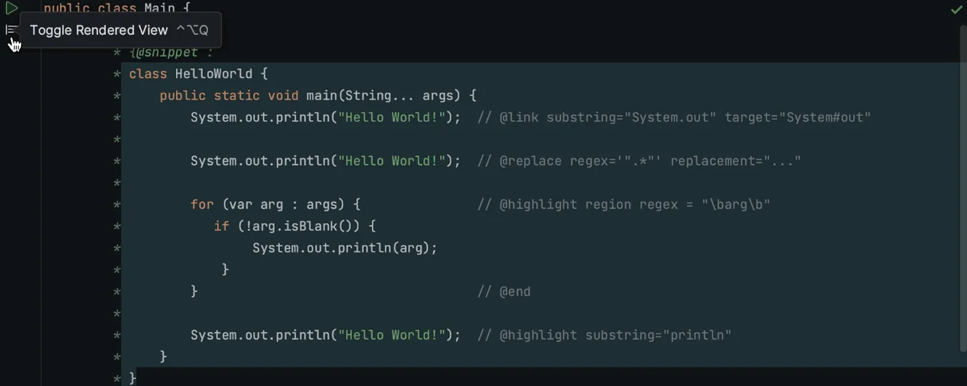IntelliJ IDEA 改进了 Javadoc 注释中的 @snippet 标记功能。 它允许在 @snippet 标记内添加标记注释,并在文档中正确呈现。 代码区域已得到支持,您可以指定要在 Javadoc 注释中引用的代码部分。 此外,IDE 现在还支持在 @snippet 标记内包含外部代码段,这将允许您引用存储在单独文件或源中的代码段,并将其包含在 Javadoc 文档中。