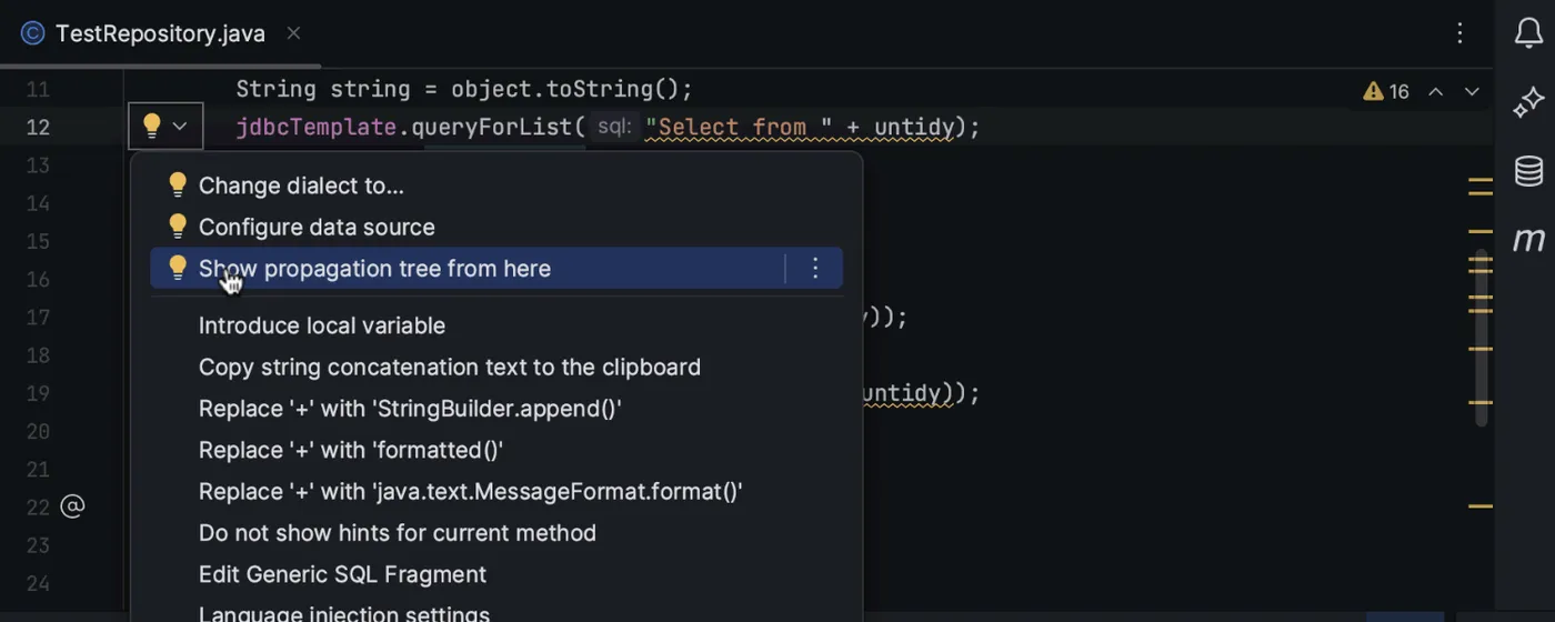 Ultimate IntelliJ IDEA 现在可以更好地分析 Java 和 Kotlin 中 SQL 的串联和内插,检测潜在的不安全查询,使代码避免可能的 SQL 注入漏洞。
