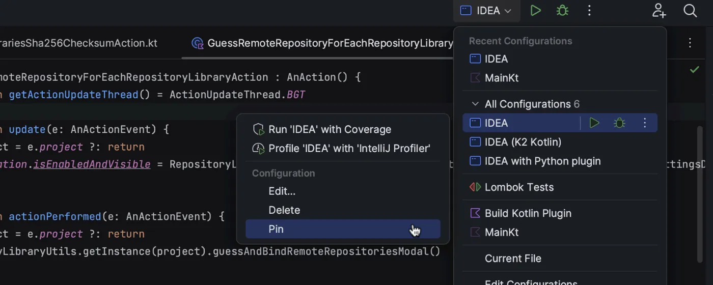 为了简化多个运行配置的管理,我们在 _Run_(运行)微件中实现了固定首选配置的选项。 要将运行配置添加到 _Pinned_(固定)部分,首先打开其名称旁边的竖三点菜单,然后选择 _Pin_(固定)。 如果有多个固定的配置,在列表中拖放即可轻松排列。 #Java
