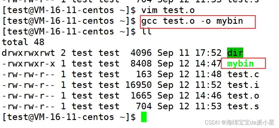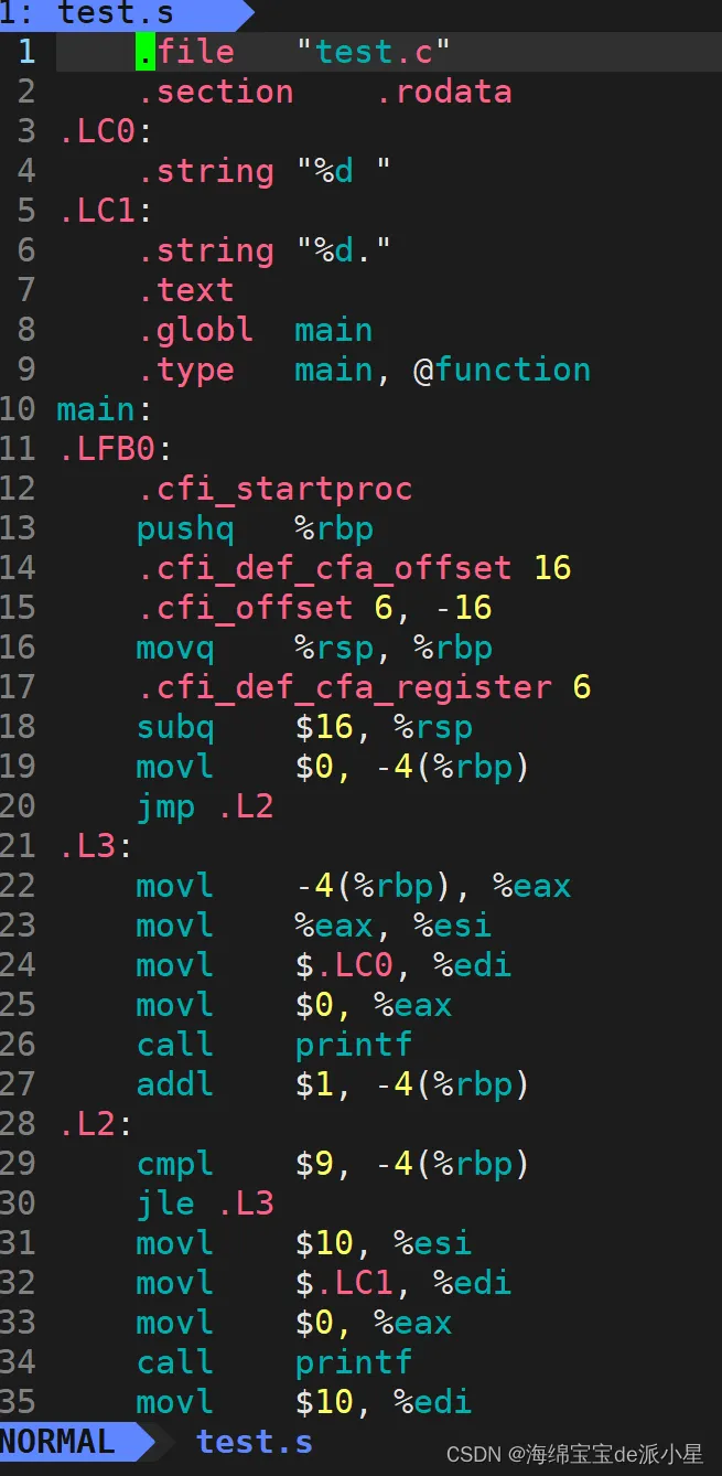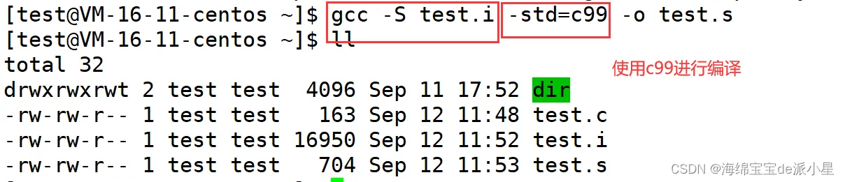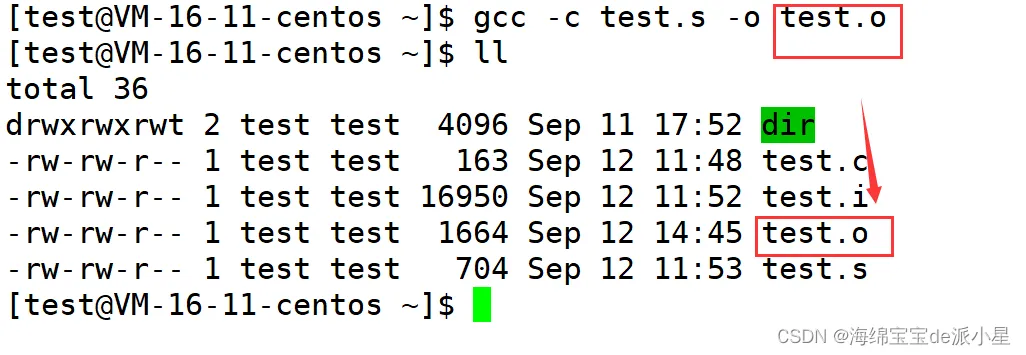 此时就形成了test.s,这个文件是进行的编译的工作,编译工作做完就停止了