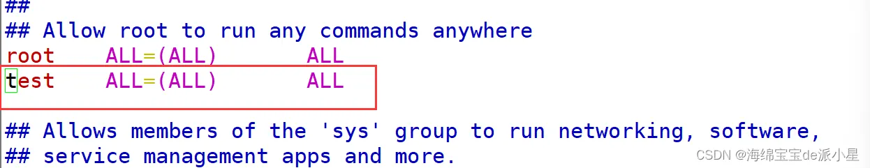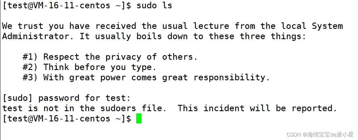 当我们作为普通用户要提权,使用root权限的时候,会被受阻,提示我们没有合适的权限,上面就是提示的样例,这是因为此时我们的test用户并没有成为root的受信任列表内,那么就需要把test这个用户加入到受信任列表内,这样就可以使用root用户的权限,而不是一次次的切换用户
