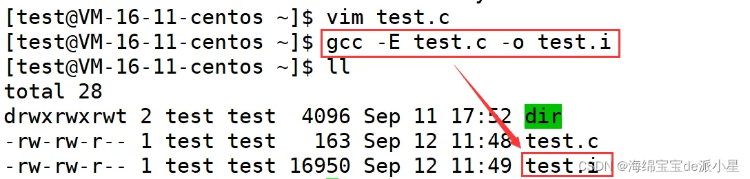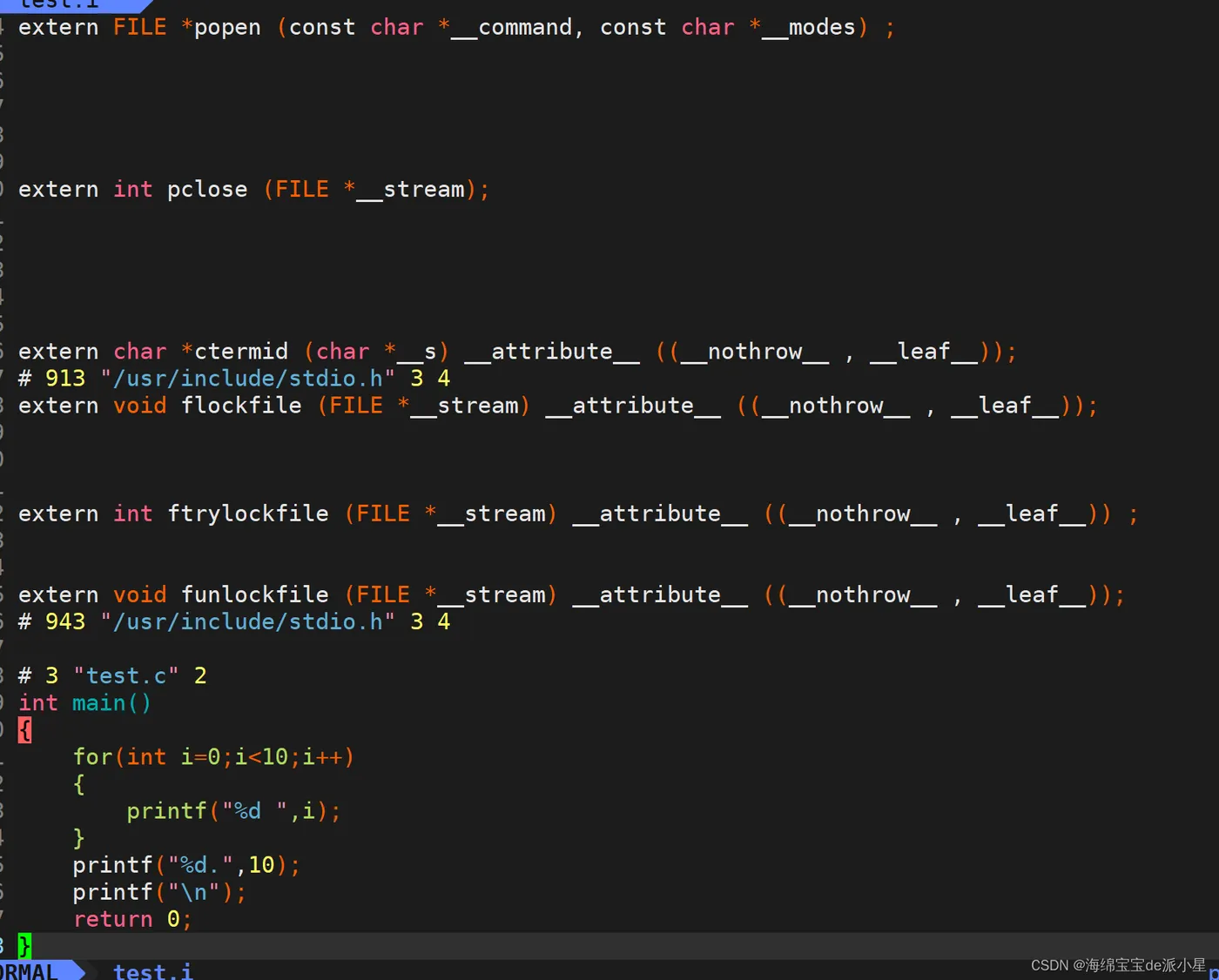 使用带-E的选项进行编译,可以形成一个经过预处理后的文件,这个文件依旧是c语言文件,只是进行了一些初步的替换和头文件展开等操作