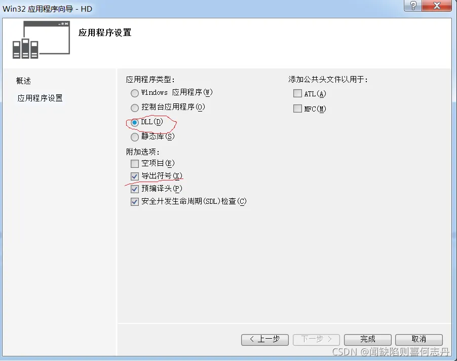 向导的应用程序类型选择:DLL,勾选“导出符号”。