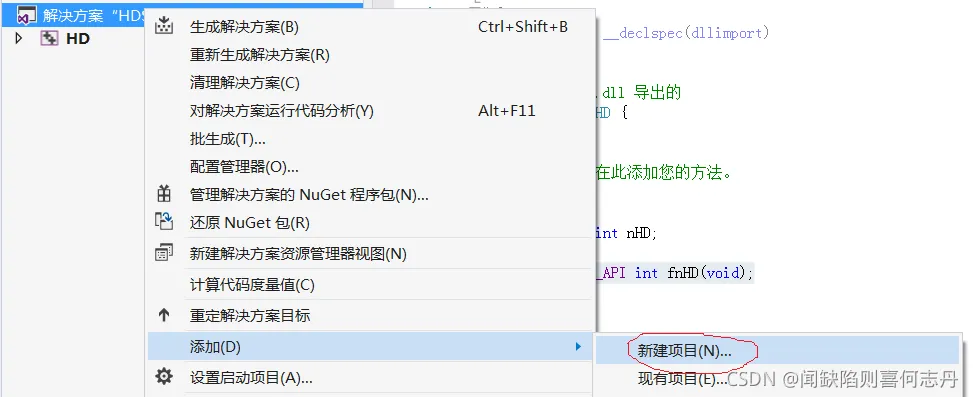 三,解决方案上鼠标右键,在菜单中选择“增加新项目”。