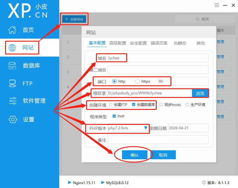 域名- 本地lychee网站的域名,可随意输入;端口– 本地lychee网页的输出端口,只要选择未被占用的端口即可;根目录– 即lychee网页文件存放位置;程序类型–lychee是web图床程序,运行需要依赖php7.2+,因此选择php7.2.9创建数据库– 由于lychee网站运行需要依赖数据库,因此我们也要为lychee设置数据库,只要勾选“创建环境”列的“创建数据库”即可。