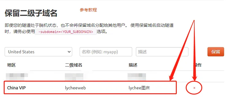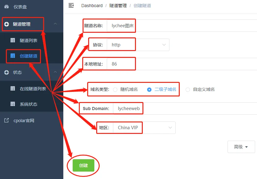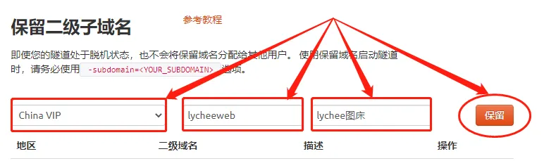 地区(服务器所在区域,就近选择即可)二级域名(会最终出现在生成的公共互联网地址中,作为网络地址的标识之一)描述(可以看做这条数据隧道的描述,能够与其他隧道区分开即可)。