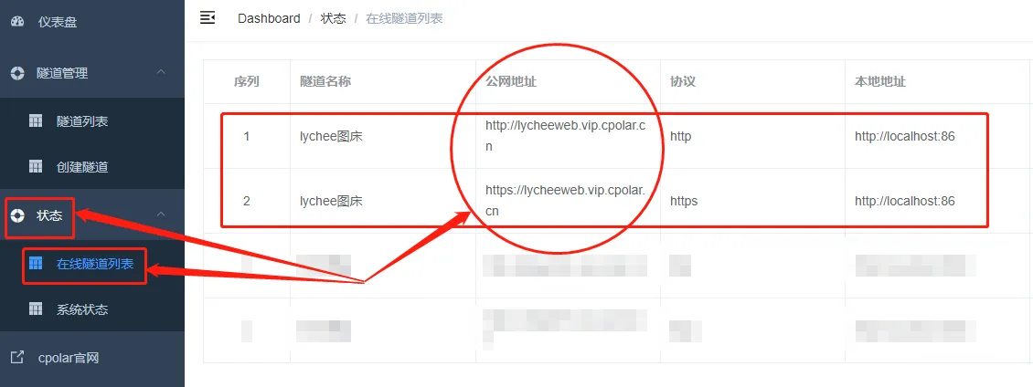 最后,我们点击左侧“状态”项下的“在线隧道列表”按钮,就能找到lychee网站的公共互联网地址。
