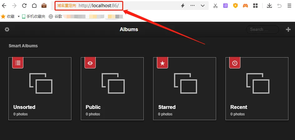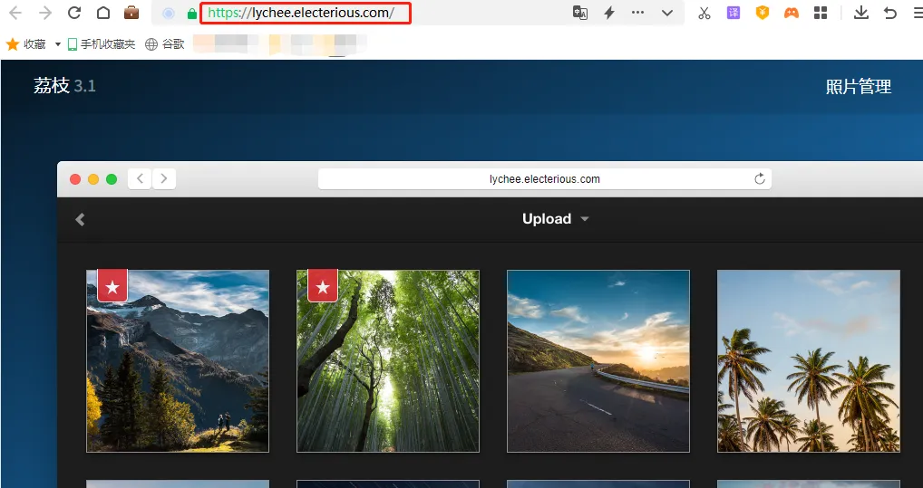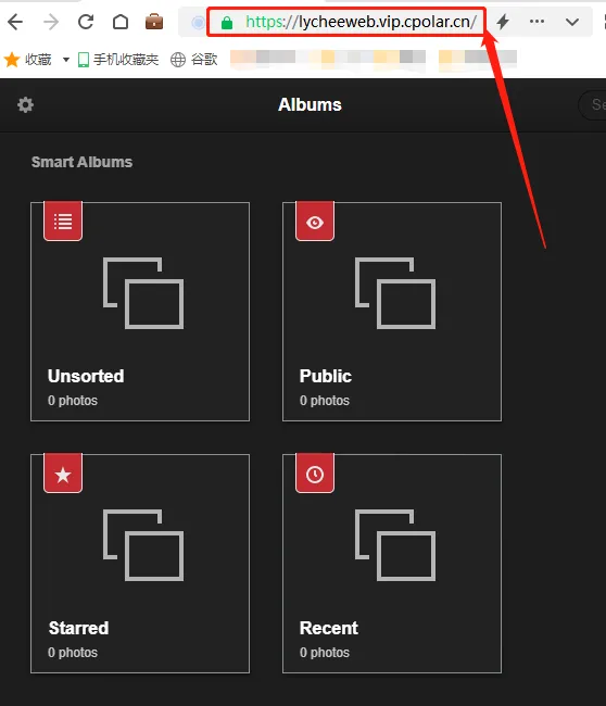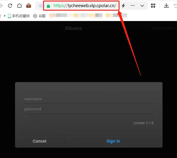 将这个地址粘贴到浏览器中,就能看到本地lychee网站的登录页面,在输入登录名和密码后,就可以在公共互联网上访问到本地的图床页面。
