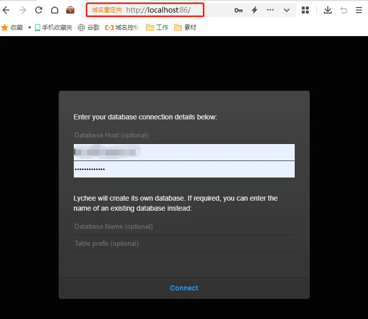 设置好lychee网页后,就可以在浏览器中输入localhost:端口号,访问到本地的lychee网页登录界面,此处需要输入的登录账户和密码,则是之前设置lychee网站的数据库登录名和密码。