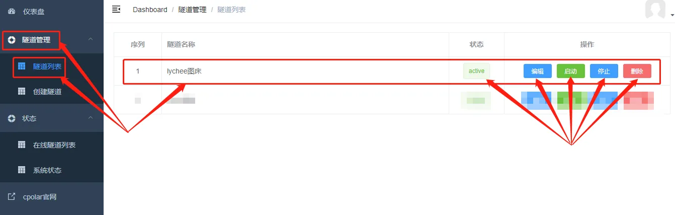 完成这些设置后,就可以点击页面下方的“创建”按钮,创建起能在公共互联网访问本地lychee网站的数据隧道。我们可以在“隧道管理”项下的“隧道列表”页面中,对这条数据隧道进行管理,包括开启、关闭或删除这条隧道,也可以点击“编辑”按钮,对这条数据隧道的信息进行修改。