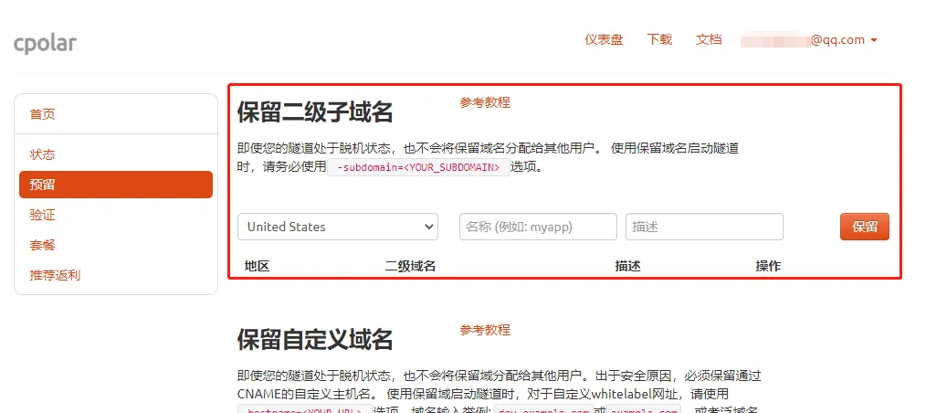 下一步,我们登录cpolar的官网,在用户主页面左侧找到“预留”按钮,并点击进入cpolar的数据隧道预留页面。在这里设置一个公共互联网地址(可以看做数据隧道的入口),由于此时这个地址没有连接本地的软件输出端口,因此也可以看做是一条空白的数据隧道。