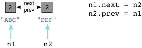 跟Ruby不同的是,Python中你可以在代码运行的时候动态定义实例变量或对象属性。这看起来似乎有点像Ruby缺失了某些有趣的魔法。(声明下我不是一个Python程序员,所以可能会存在一些命名方面的错误)。我们设置 n1.next 指向 n2,同时设置 n2.prev 指回 n1。现在,我们的两个节点使用循环引用的方式构成了一个双向链表。同时请注意到 ABC 以及 DEF 的引用计数值已经增加到了2。这里有两个指针指向了每个节点:首先是 n1 以及 n2,其次就是 next 以及 prev。