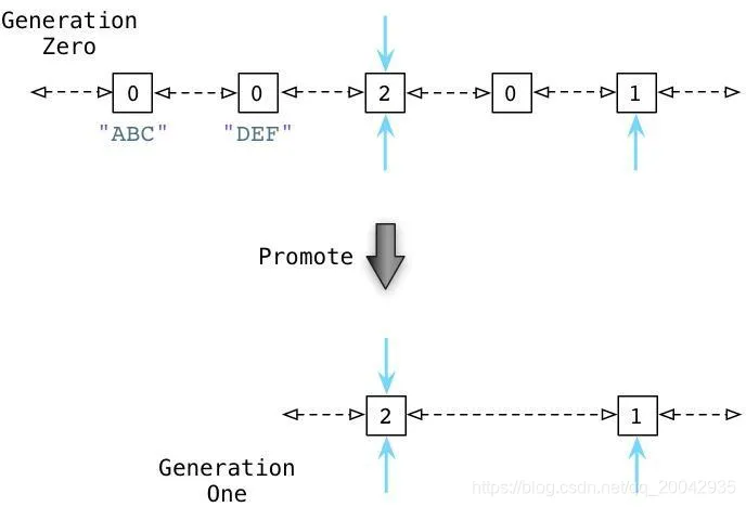 从上面可以看到 ABC 和 DEF 节点包含的引用数为1.有三个其他的对象同时存在于零代链表中,蓝色的箭头指示了有一些对象正在被零代链表之外的其他对象所引用。(接下来我们会看到,Python中同时存在另外两个分别被称为一代和二代的链表)。这些对象有着更高的引用计数因为它们正在被其他指针所指向着。