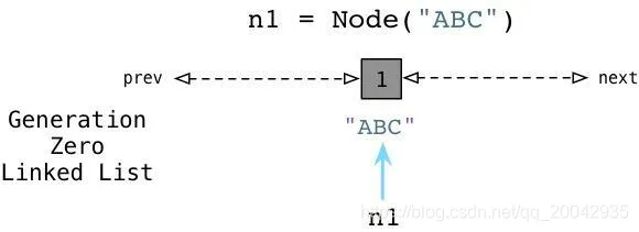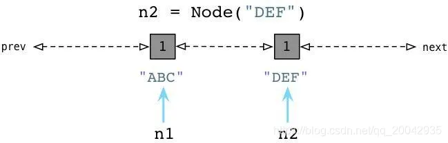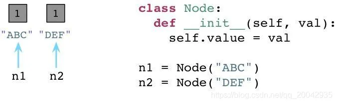 我们有一个"构造器"(在Python中叫做 init ),在一个实例变量中存储一个单独的属性。在类定义之后我们创建两个节点,ABC以及DEF,在图中为左边的矩形框。两个节点的引用计数都被初始化为1,因为各有两个引用指向各个节点(n1和n2)。