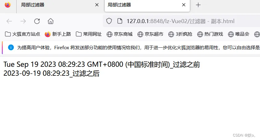 <!DOCTYPE html> <html> <head> <meta charset="utf-8"> <script src="https://cdn.bootcdn.net/ajax/libs/jquery/3.7.1/jquery.js"></script> <!-- 1.导入vue在线依赖--> <script src="https://cdn.bootcdn.net/ajax/libs/vue/2.6.10/vue.js"></script> <script src="js/date.js"></script> <title>局部过滤器</title> <!-- 2.定义vue所管理的边界(有且只有一个根节点) --> <script src="date.js" type="text/javascript" charset="utf-8"></script> <body> <!-- 定义边界 --> <div id="app"> {{msg}}_过滤之前<br> {{msg | all}}_过滤之后 </div> </body> <script type="text/javascript"> // 全局过滤器 Vue.filter('all', function(value) { return fmtDate(value); }); new Vue({ el: '#app', data(){ return{ msg:new Date() } } }) </script> </head> <body> </body> </html>