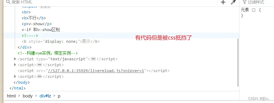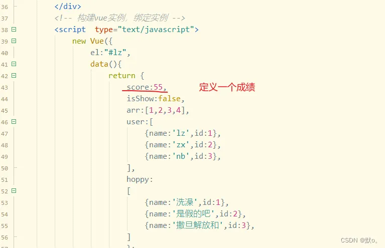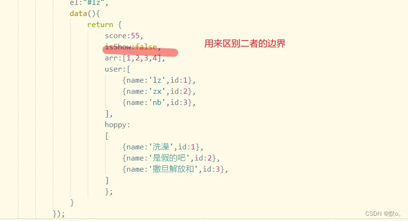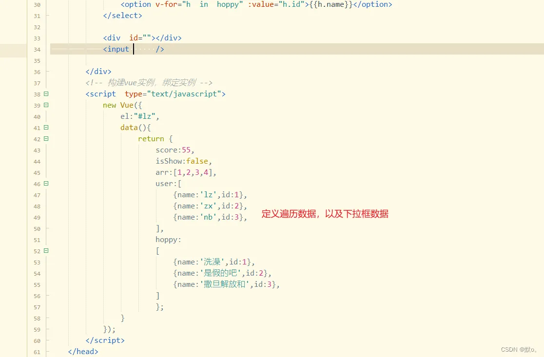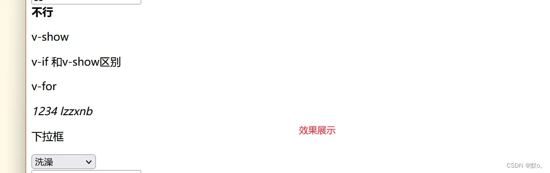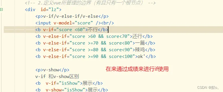 <!DOCTYPE html> <html> <head> <meta charset="utf-8"> <script src="https://cdn.bootcdn.net/ajax/libs/jquery/3.7.1/jquery.js"></script> <!-- 1.导入vue在线依赖--> <script src="https://cdn.bootcdn.net/ajax/libs/vue/2.6.10/vue.js"></script> <title>Vue入门</title> <!-- 2.定义vue所管理的边界(有且只有一个根节点) --> <div id="lz"> <p>v-if/v-else-if/v-else</p> <input v-model="score" /><br/> <b v-if="score <60">不行</b> <b v-else-if="score >60 && score<70">还行</b> <b v-else-if="score >=70 && score<80">一篇</b> <b v-else-if="score >=80 && score<90">辣鸡</b> <b v-else-if="score >=90 && score<100">ok'</b> <p>v-show</p> v-if 和v-show区别 <b v-if="isShow">展示</b> <b v-show="isShow">展示</b> <p>v-for</p> <i v-for="a in arr">{{a}}</i> <i v-for=" u in user">{{u.name}}</i> <p>下拉框</p> <select> <option v-for="h in hoppy" :value="h.id">{{h.name}}</option> </select> <div id="" v-for="h in hoppy"></div> <input type="checkbox" name="hoppy" :value="h.id"/>{{h.name}} </div> <!-- 构建vue实例,绑定实例 --> <script type="text/javascript"> new Vue({ el:"#lz", data(){ return { score:55, isShow:false, arr:[1,2,3,4], user:[ {name:'lz',id:1}, {name:'zx',id:2}, {name:'nb',id:3}, ], hoppy: [ {name:'洗澡',id:1}, {name:'是假的吧',id:2}, {name:'撒旦解放和',id:3}, ] }; } }); </script> </head> <body> </body> </html>