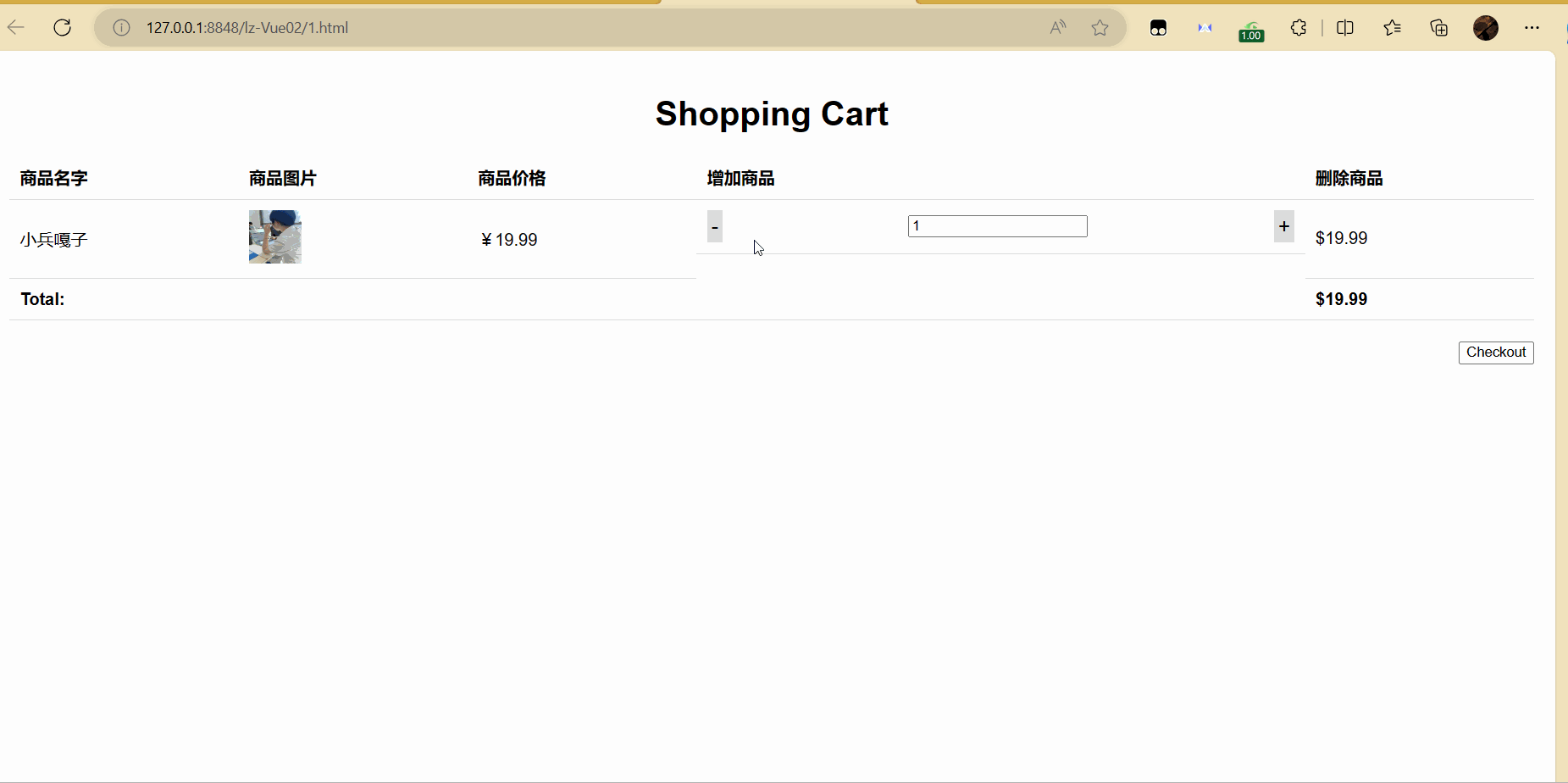 <!DOCTYPE html> <html> <head> <title>Shopping Cart</title> <style> /* CSS 样式可以根据需求自行设计 */ body { font-family: Arial, sans-serif; margin: 0; padding: 20px; } h1 { text-align: center; } table { width: 100%; border-collapse: collapse; } th, td { padding: 10px; text-align: left; border-bottom: 1px solid #ddd; } tr:hover { background-color: #f5f5f5; } .total { font-weight: bold; text-align: right; } .quantity-input { display: flex; justify-content: space-between; align-items: center; } .quantity-btn { cursor: pointer; background-color: #ddd; border: none; font-size: 1.2rem; padding: 4px; } .checkout-btn { display: block; margin-top: 20px; text-align: right; } </style> </head> <body> <h1>Shopping Cart</h1> <table> <thead> <tr> <th>商品名字</th> <th>商品图片</th> <th>商品价格</th> <th>增加商品</th> <th>删除商品</th> </tr> </thead> <tbody> <tr> <td>小兵嘎子</td> <td><img src="img/微信图片_20230918163623.jpg" width="50" height="50"></td> <td class="price">¥19.99</td> <td class="quantity-input"> <button class="quantity-btn minus">-</button> <input type="number" min="1" value="2"> <button class="quantity-btn plus">+</button> </td> <td class="subtotal">¥39.98</td> </tr> </tbody> <tfoot> <tr class="total"> <td colspan="4">Total:</td> <td id="total">$69.95</td><!-- 替换为购物车的真实总额 --> </tr> </tfoot> </table> <div class="checkout-btn"> <button>Checkout</button> </div> <script> const quantityInputs = document.querySelectorAll('.quantity-input input'); quantityInputs.forEach(input => { input.addEventListener('change', updateSubtotal); }); const minusBtns = document.querySelectorAll('.minus'); const plusBtns = document.querySelectorAll('.plus'); minusBtns.forEach((btn, index) => { btn.addEventListener('click', () => { let currentVal = Number(quantityInputs[index].value); if (currentVal > 1) { quantityInputs[index].value = currentVal - 1; updateSubtotal(); } }); }); plusBtns.forEach((btn, index) => { btn.addEventListener('click', () => { let currentVal = Number(quantityInputs[index].value); quantityInputs[index].value = currentVal + 1; updateSubtotal(); }); }); function updateSubtotal() { const prices = document.querySelectorAll('.price'); const quantities = document.querySelectorAll('.quantity-input input'); const subtotals = document.querySelectorAll('.subtotal'); let total = 0; for (let i = 0; i < prices.length; i++) { const price = Number(prices[i].textContent.slice(1)); const quantity = Number(quantities[i].value); const subtotal = price * quantity; subtotals[i].textContent = '$' + subtotal.toFixed(2); total += subtotal; } document.querySelector('#total').textContent = '$' + total.toFixed(2); } </script> </body> </html>