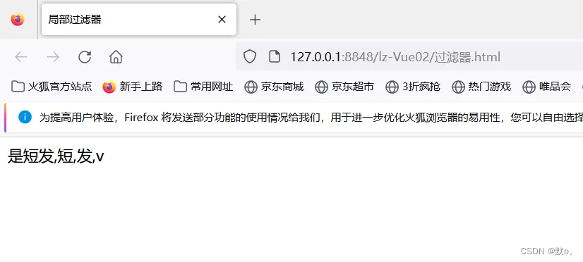 <!DOCTYPE html> <html> <head> <meta charset="utf-8"> <script src="https://cdn.bootcdn.net/ajax/libs/jquery/3.7.1/jquery.js"></script> <!-- 1.导入vue在线依赖--> <script src="https://cdn.bootcdn.net/ajax/libs/vue/2.6.10/vue.js"></script> <script src="js/date.js"></script> <title>局部过滤器</title> <!-- 2.定义vue所管理的边界(有且只有一个根节点) --> <div id="app"> {{msg|all}},{{msg|single}},{{msg|all|single}},{{msg|param(4,5)}} </div> </body> <script type="text/javascript"> new Vue({ el: '#app', data() { return { msg:"还是短发v江户时代列举法" }; }, filters:{ 'all': function(val) { return val.substring(1, 4); }, 'single':function(val){ return val.substring(2,3); }, 'param':function(val,start,end){ return val.substring(start,end); } } }) </script> </head> <body> </body> </html>