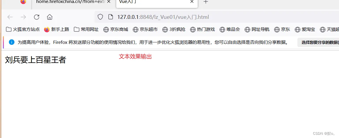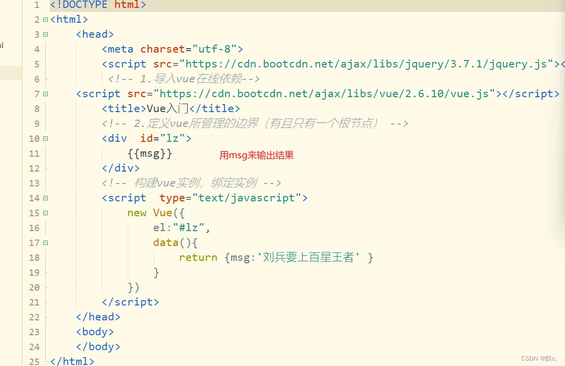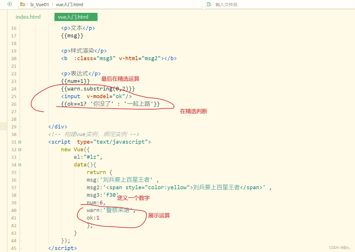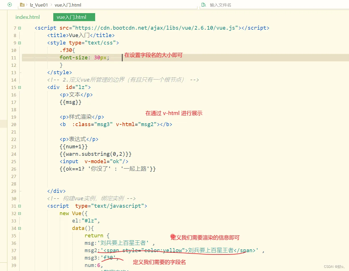 <!DOCTYPE html> <html> <head> <meta charset="utf-8"> <script src="https://cdn.bootcdn.net/ajax/libs/jquery/3.7.1/jquery.js"></script> <!-- 1.导入vue在线依赖--> <script src="https://cdn.bootcdn.net/ajax/libs/vue/2.6.10/vue.js"></script> <title>Vue入门</title> <style type="text/css"> .f30{ font-size: 30px; } </style> <!-- 2.定义vue所管理的边界(有且只有一个根节点) --> <div id="lz"> <p>文本</p> {{msg}} <p>样式渲染</p> <b :class="msg3" v-html="msg2"></b> <p>表达式</p> {{num+1}} {{warn.substring(0,2)}} <input v-model="ok"/> {{ok==1? '你没了' : '一起上路'}} </div> <!-- 构建vue实例,绑定实例 --> <script type="text/javascript"> new Vue({ el:"#lz", data(){ return { msg:'刘兵要上百星王者' , msg2:'<span style="color:yellow">刘兵要上百星王者</span>' , msg3:'f30', num:6, warn:'警察来咯', ok:1 }; } }); </script> </head> <body> </body> </html>